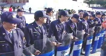 三百多名镇暴警察拿着盾牌围成人墙,一步步往“大中至正”牌楼外走,希望驱离还在牌楼内的民众。(台湾TVBS图)