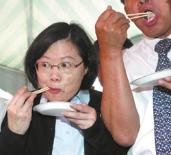 “拜票轻松”:民进党主席候选人蔡英文(左)2日拜会民进党“立法院”党团寻求支持,并参加在台“立法院”内广场举行的恒春洋葱料理促销活动,品尝优质洋葱料理。(台湾《中国时报》图片)
