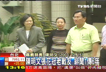 民进党籍嘉义县长陈明文(右)和民进党“立委”张花冠(中)的绯闻一直挥之不去。图片来源:台湾TVBS电视台