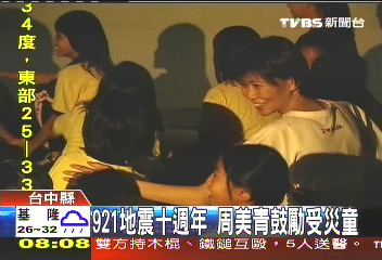 中新网9月8日电 据台湾TVBS报道,台湾921地震十周年,马英九夫人周美青,昨天下午以“周老师”的身份,陪当年的灾童看纪录片。