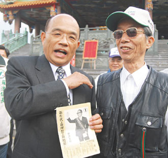 苏贞昌(左)昨到宜兰辅选,支持者林阿山拿出30年前的老文宣,向他要签名。来源:台湾《联合报》
