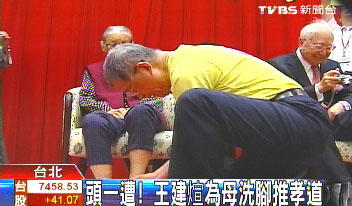 中国台湾网11月6日消息 据台湾“中央社”报道,台湾“监察院”今天举办“母亲才是生日主角”庆生会,“监察院长”王建煊帮高龄94岁的母亲张瑞华洗脚。他说希望下次有机会邀马英九帮母亲秦厚修洗脚。