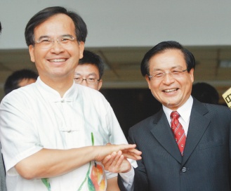 大台南选战,台南县长苏焕智(左)今开第一枪宣布参选,台南市长许添财(右)的进场式也演练好了,日后不容易看到这样的哥俩好了。台湾《联合报》资料照片