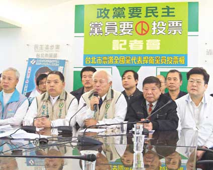 10多位民进党代表昨天齐聚民进党台北市党部,高呼“政党要民主、党员要投票”,吁民进党中央三思,不要漠视党员价值。图片来源:台湾《联合报》