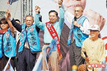 吴敦义(右2)利用假日南下嘉义县替国民党“立委”补选参选人林德瑞造势。图片来源:台湾《苹果日报》