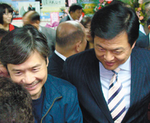 国民党台北县党部新主委布达典礼,党中央秘书长金溥聪(中间左)与县长周锡玮互动热络。图片来源:台湾《联合晚报》