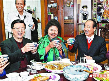 王金平春节期间都会回高雄县路竹乡老家,选定日期以“办桌”方式邀请各界参加感恩餐会,昨晚在乡内席开70桌宴请各界友人,席间有不少政坛人士,包括“立委”黄昭顺、侯彩凤、林益世等,高雄县长杨秋兴每年都会出席参加,今年也不例外,杨秋兴并逐桌向与会者祝贺新年好,王金平也祝福杨秋兴“心想事成”。