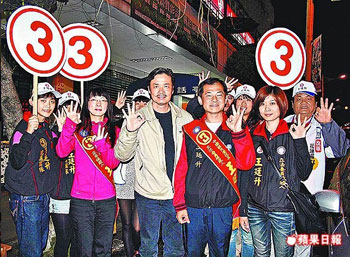 国民党秘书长金溥聪(中)昨陪着国民党花莲“立委”补选候选人王廷升到花莲综合市场拉票。来源:台湾《苹果日报》