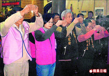民进党主席蔡英文(左二)昨前往花莲城隍庙祈福,并替民进党籍候选人萧美琴助选。来源:台湾《苹果日报》