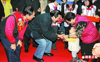 马发红包时频问幼童说:“知不知道我是谁?”有人答对,但也有人盯着他的脸叫“叔叔”,马乐得说:“我很年轻(注:马英九生于1950年),没叫我爷爷就好了!”(高大林)
