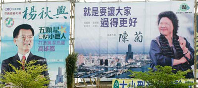 杨秋兴阵营表示,杨秋兴和陈菊两人在高雄市中山四路、平和东路口都立了广告牌,却只有杨阵营收到罚单。来源:台湾《联合报》