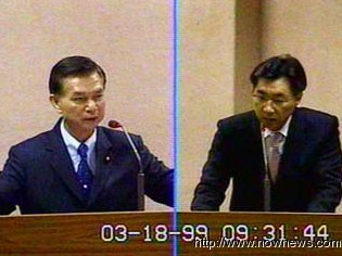 女婿台当局“新闻局长”江启臣(右)接受岳父民代刘盛良(左)的质询。 来源台湾“今日新闻网”