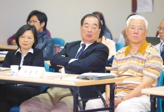 民进党“十年政纲”首场座谈会,大老尤清(右)到场踢馆,质疑党主席蔡英文(左)从未立过选举战功。图为两人隔着民进党人士罗福全(中)听取报告,互动尴尬。图片来源:台湾《联合报》