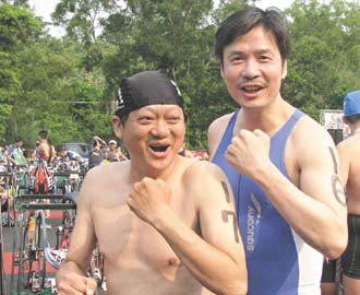 国民党秘书长金溥聪(右)与台当局前“卫生署长”叶金川昨天到苗栗县参加铁人三项竞赛,赛前相互呛声拚输赢。图片来源:台湾《联合报》