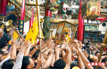 大甲镇澜宫妈祖进庙时信众抢摸妈祖本尊希望得到好运。来源:台湾《苹果日报》