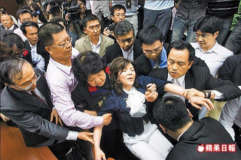 民进党“立法院”党团一早就占据“教育及文化委员会”阻挠会议进行,民进党籍民代用手捂着会议主席赵丽云(中)的嘴。图片来源:台湾《联合报》