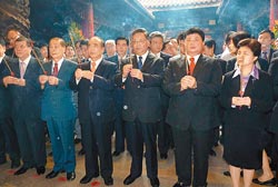 福建省长黄小晶(右三)与台“立法院长”王金平(左三)、镇澜宫董事长颜清标(右二),向镇澜宫妈祖上香祝寿。图片来源:台湾《中国时报》