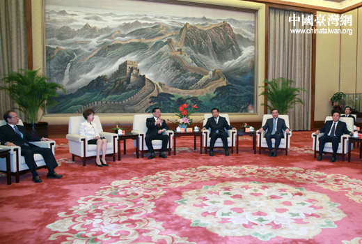 中国台湾网5月7日北京消息 中共中央政治局常委、全国政协主席贾庆林7日下午在北京人民大会堂会见了前来大陆参访的中国国民党荣誉主席连战一行。(中国台湾网 田云鹏 摄)