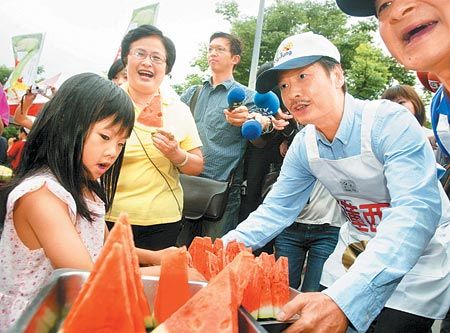 左撇子的金溥聪拿起西瓜刀,俐落地切开一个大西瓜。 来源:台湾《中国时报》