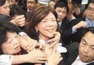 民进党“立法院”党团占据主席台阻挠会议进行,民进党籍民代用手捂着会议主席赵丽云(中)的嘴。图片来源:台湾《联合报》
