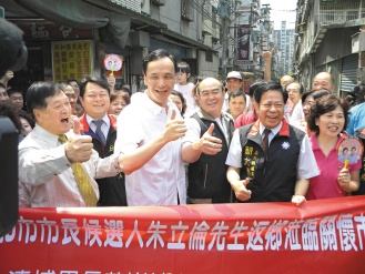 台当局前“行政院副院长”朱立伦(前排左二)投入新北市长选举,昨天到中和市与乡亲博感情,受到当地民众热烈欢迎。图片来源:台湾《联合报》