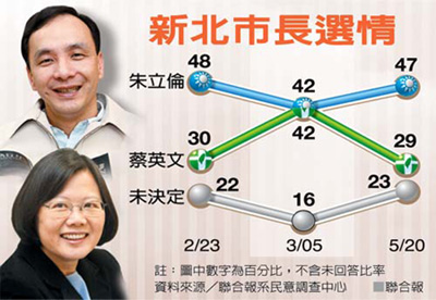中国台湾网5月21日消息 据台湾《联合报》报道,台湾新北市长(由台北县升格)最新选情调查发现,如果民进党的蔡英文投入新北市长选举对上国民党的朱立伦,朱立伦目前以47%支持率领先蔡英文18%;若蔡英文当选,在新北市长任内转战参选台湾地区领导人,47%台北县民表示不能接受。