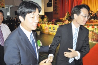 大台南市长参选人赖清德(左)和郭添财(右)昨天在台南大学毕业典礼上“王见王”,相互握手致意。(图片来源:台湾《联合报》)