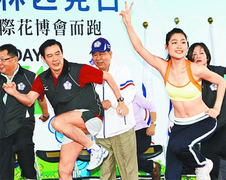 中国台湾网6月7日消息 据台湾《苹果日报》报道,马英九昨日上午参加3公里路跑,主办单位安排辣妹级舞蹈老师带领跳暖身操,马英九努力跟上节奏。(中国台湾网 陈佳慧)