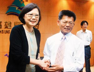 民进党主席蔡英文7日傍晚探视高雄县长杨秋兴。 图片来源:台湾《联合报》