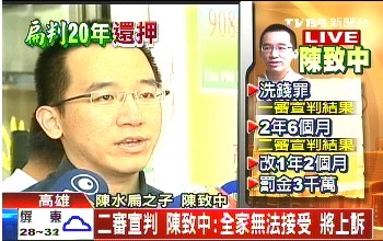 陈致中声称对于二审宣判的结果不满意。图片来源:台湾TVBS电视台