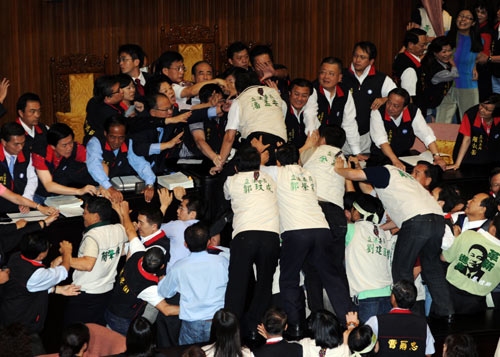 台湾“立法院”临时会8日审议ECFA(两岸经济合作框架协议),由于民进党暴力阻挠表决,现场爆发肢体冲突,多名“立委”挂彩,混乱中通过将ECFA等案径付二读。