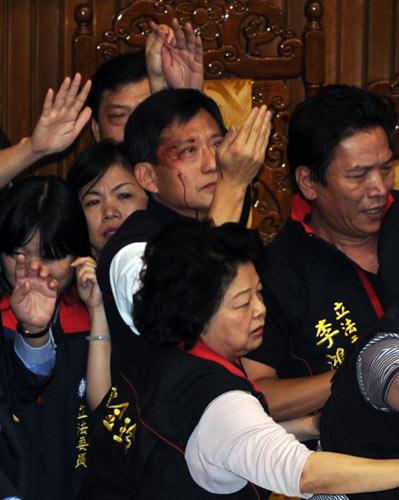 台湾“立法院”昨天爆发肢体冲突,蓝绿各有一名“立委”挂彩送医。吴育升右脸遭计时器砸伤、缝八针,民进党“立委”郭玟成被人推落主席台,两人都送往台大医院治疗;台“行政院长”吴敦义、“立法院长”王金平分别前往探视。