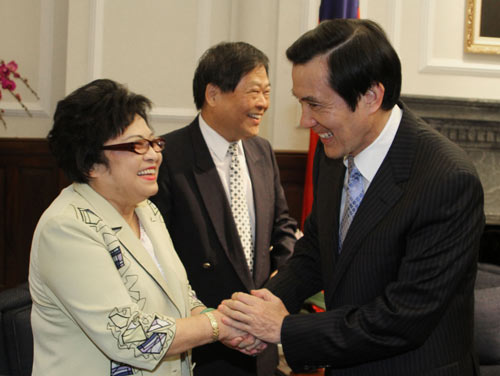 马英九(前右)8日接见吴伯雄率领的第6届两岸经贸文化论坛代表团,与台湾“人民最大党”主席许荣淑(前左)握手致意。图片来源:“中央社”