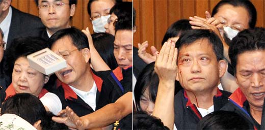 台湾“立法院”临时会昨天下午审议ECFA,爆发肢体冲突。混乱中,书本大小的定时器(左图)突然飞向国民党“立委”聚集处,击中“立委”吴育升(右图)眼角流血,送医急救,缝了八针。(台湾《联合报》图)