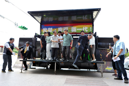 因应年底“五都”选战,民进党4日下午公布“二代小鹰号”,它以“变形金刚”为概念,改装3.5吨的货车,集指挥、宣传、舞台、移动办公室与移动商店车等多功能。不仅可担任竞选活动的指挥车、候选人战车,也是一辆可上山下海的移动舞台。