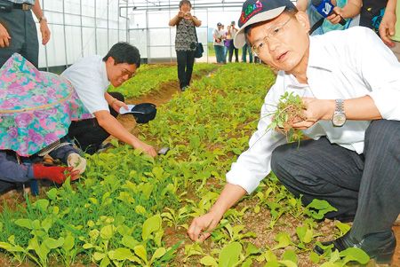 表态参选后的杨秋兴希望绿营大老不要为难他,昨天他继续走自己的路,参访农场时蹲下帮忙摘除杂草。图片来源:台湾中国时报