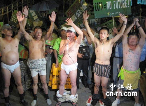 蔡丁贵(中)等人在ECFA审查通过后,再度脱下上衣与外裤,说民进党保住他们的内裤。(中评社 黄筱筠摄)