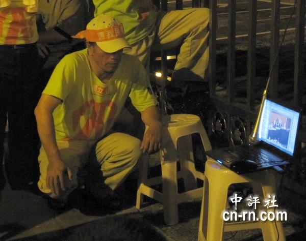 蔡丁贵等人在ECFA审查时,一路盯着议场视讯掌握状况。(中评社 黄筱筠摄)
