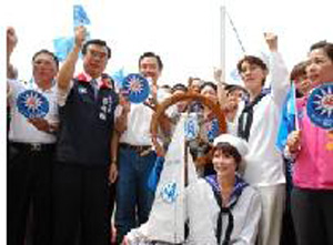 黄昭顺今天在高雄港“香蕉码头”举行造势活动,和女儿陈菁徽一起穿上水手服,在金溥聪的陪同下登上“顺”字号帆船启航出港,宣誓未来将带领高雄经济起飞。