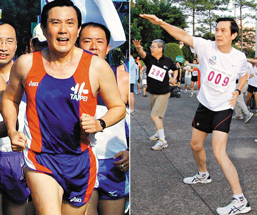 马英九(右)起跑前与民众一同在台下做暖身操,这次他穿的运动短裤与以前的比似乎长了些。马英九以前的运动装扮(左)。 来源:《联合晚报》