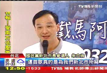 中国台湾网8月28日消息 据台湾TVBS电视台报道,国民党新北市参选人朱立伦,今天公布竞选歌曲,歌曲为22年前歌手张雨生创作的《没有不可能的事》;而民进党新北市参选人蔡英文,则是选择卡通“小英的故事”做主题曲。