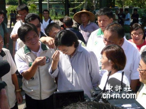 蔡英文小心翼翼取下在头上的不明小东西,原来是螳螂。(中评社 邹丽泳摄)