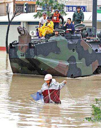 台军方出动水陆两栖战车至高雄市楠梓区紧急救援,有些民众则在水里悠闲地捕鱼。 来源:台湾《中国时报》