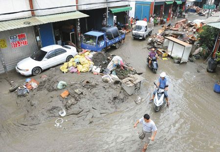 “凡亚比”台风造成台湾南部灾情惨重,20日高雄县仁武中华村积水退去,居民忙著清洗房子,街道上堆满烂泥、垃圾。来源:台湾《中国时报》