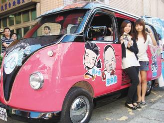 朱立伦的“朱朱伦行动写真车”,结合实时拍照、取照及蓝芽传讯等功能,颜色采桃红搭配黑色,一点都不蓝。来源:台湾《联合报》