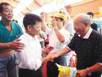 高雄县长杨秋兴(左二)到高雄左营成立第一个眷村后援会,直捣蓝营基本盘。 图片来源:台湾《联合报》