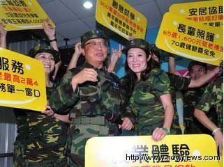 中国台湾网10月15日消息 据台湾“今日新闻网”报道,台中市长胡志强今日(15日)下午上演了一场搞笑版的新兵日记。胡志强化身“胡班长”,带领扮演士兵(班兵)的8位市议员参选人,在竞选总部发表“大台中青年政策”白皮书。