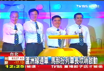 中国台湾网11月3日消息 据台湾TVBS电视台报道,台北捷运芦洲线今(3)日下午正式通车,台湾地区领导人马英九、台当局“行政院长”吴敦义、台北市长郝龙斌、台北县长周锡玮打扮成台北捷运列车长,正式启动芦洲线。