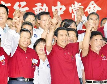 国民党主席马英九拉着台北市长郝龙斌的手高喊“冻蒜”(指当选)。图片来源:台湾《中国时报》