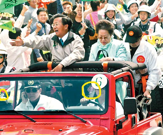 2004年3月19日,陈水扁、吕秀莲在陈水扁的老家台南被枪击,此案经专案小组及台南地检署侦办后,宣称凶手是已经死亡的台南市民陈义雄。“两颗子弹”已在岛内成了一个专有名词,谁听了都会神秘一笑。因为2004年投票前夕发生的枪击事件,表面上是迷雾重重,但仿佛谁都能分析得透彻明了。